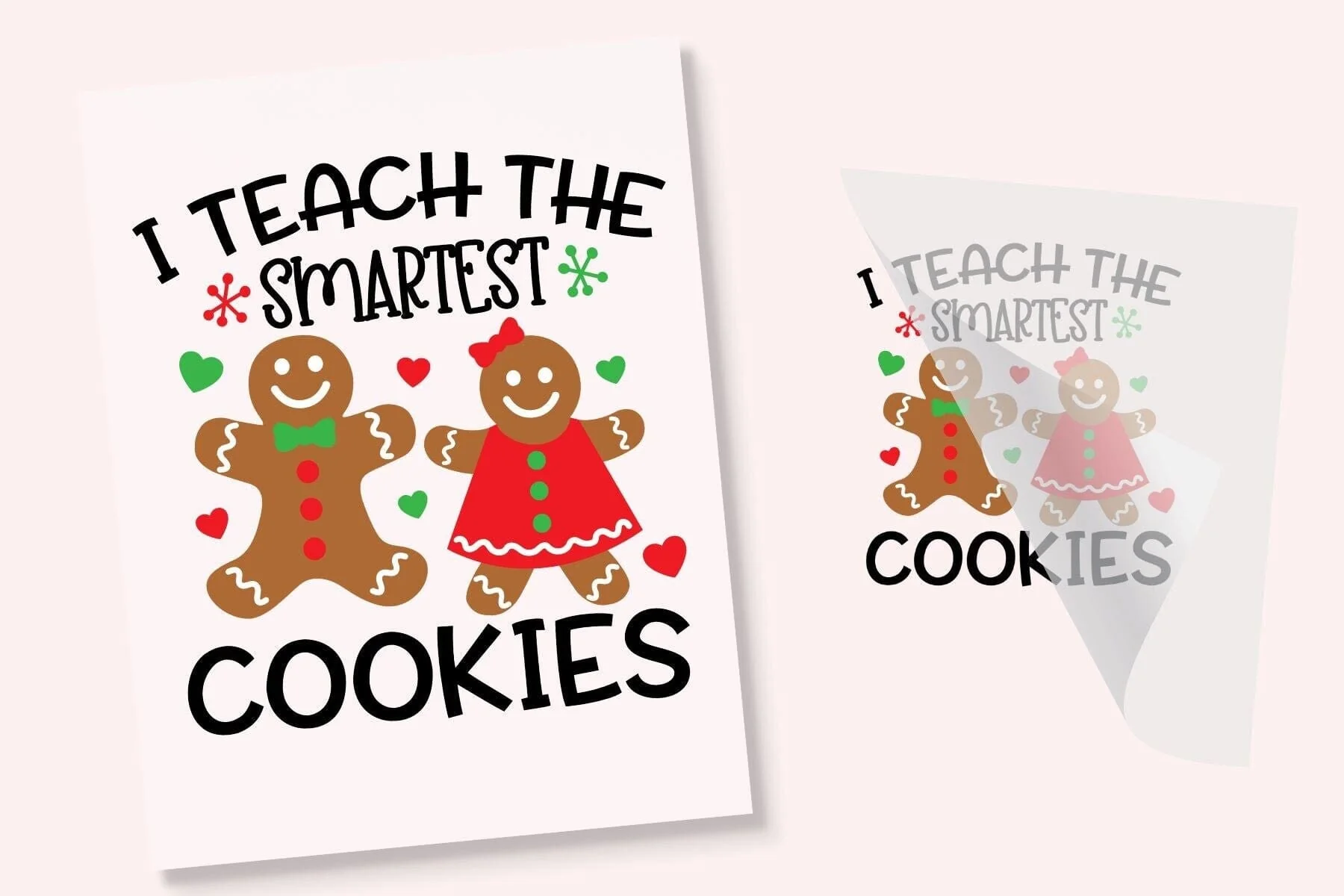 Adorable gingerbread cookie Christmas Teacher Iron On T Shirt Transfer! Goes on any color shirt, hat, bag or other garment. Turn a boring shirt into a custom graphic tee with the rainbow Christmas Teacher Ready to Press DTF transfer that applies in just 15 seconds